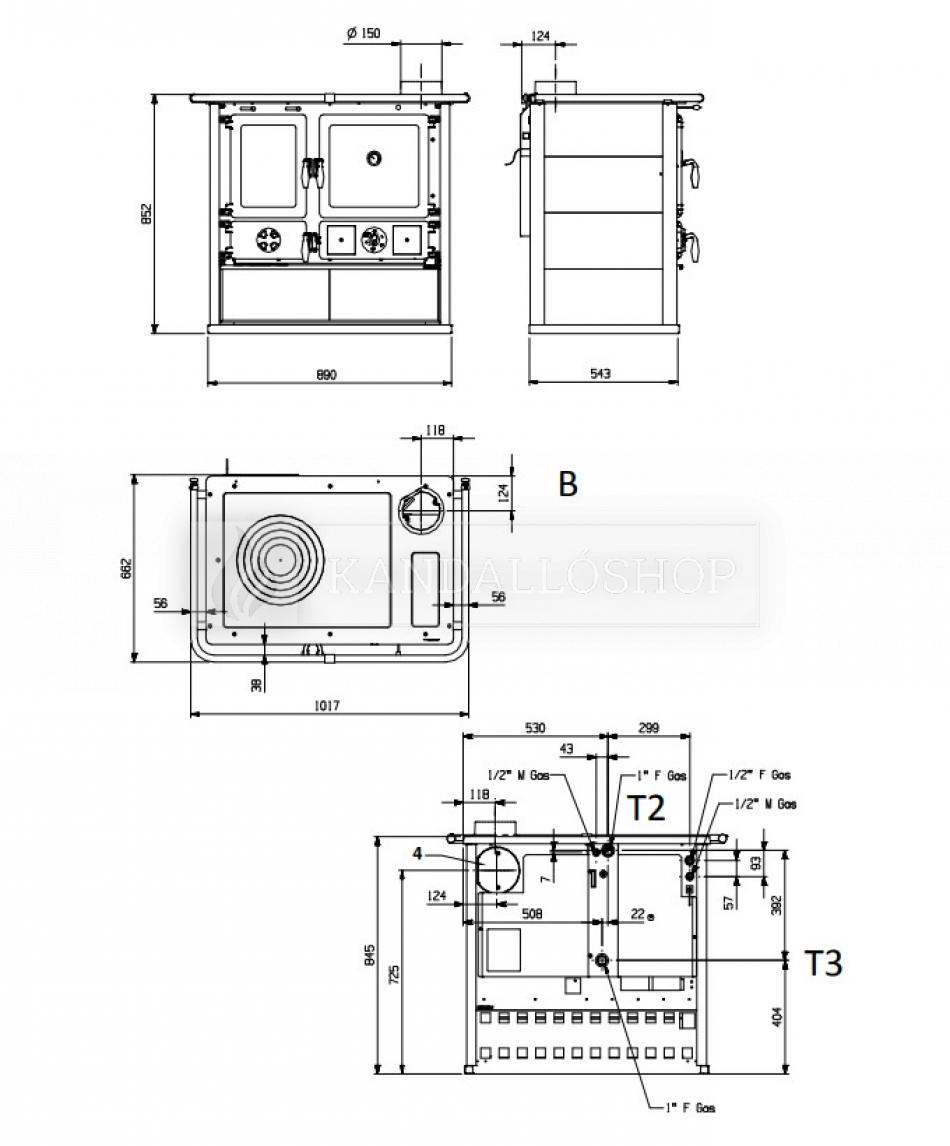 -La Nordica vízteres tűzhely főzőlappal és zománcozott sütővel. A tűztér, a főzőlap és a keret is öntöttvasból készültek. Alul tárolórekesszel felszerelt.