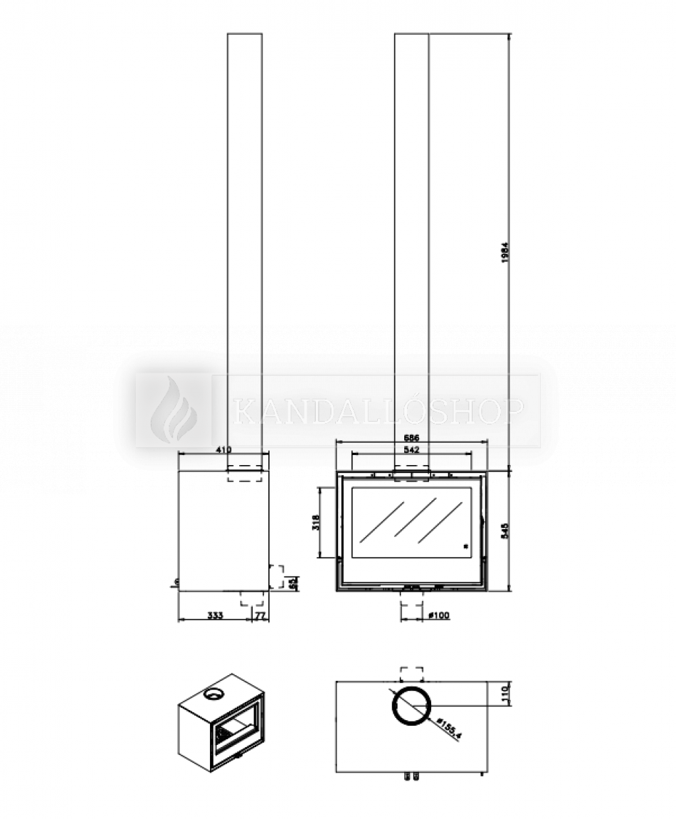 ⇒ Szükséges füstcső - hossza választható (490 mm/990 mm/1980 mm), átmérője 150 mm. (1. kép)