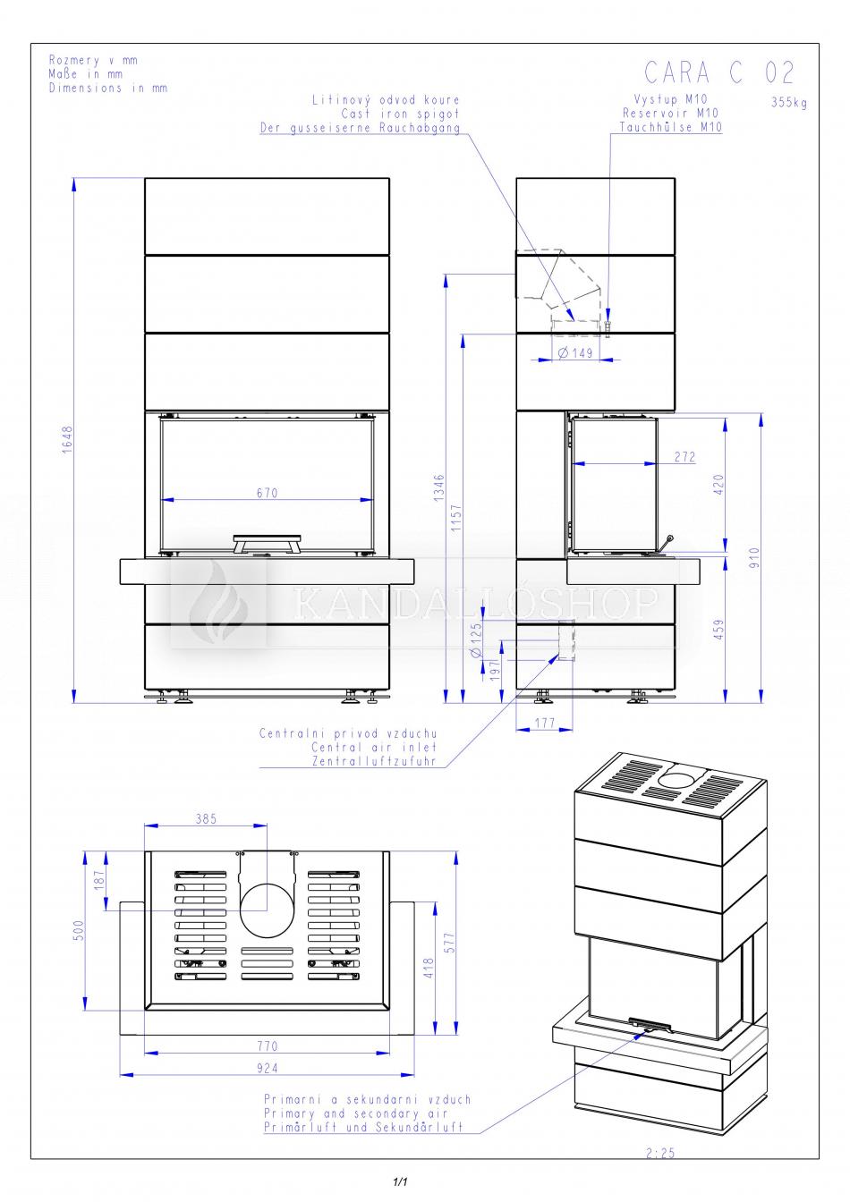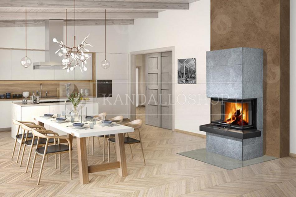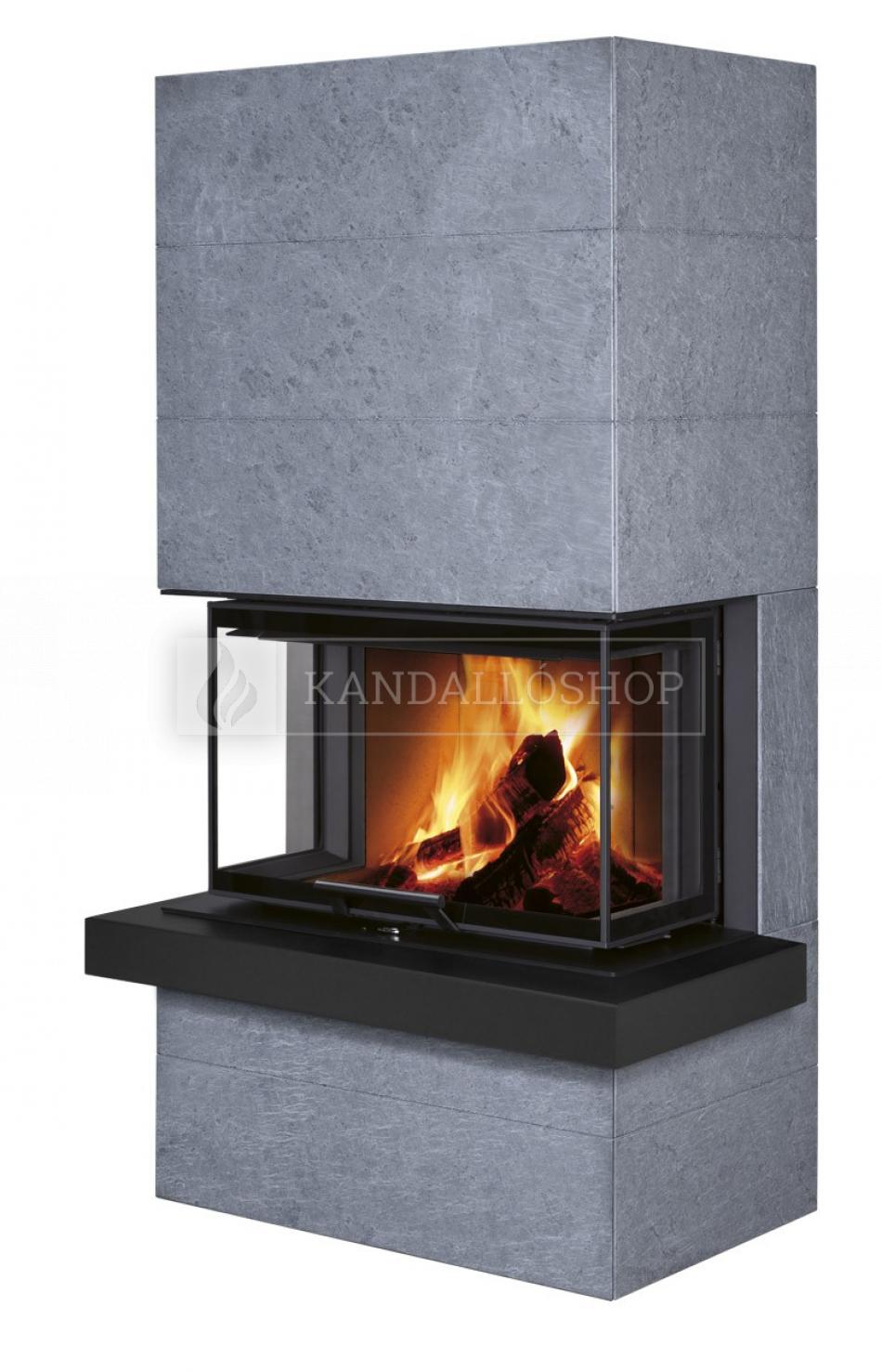 Romotop Cara C légfűtéses kandallóbetét exkluzív kivitelben, C alakú, három oldali üveg, erős konstrukció, samott tűztér, liftes tolóajtó, osztott üveggel, zsírkő borítással